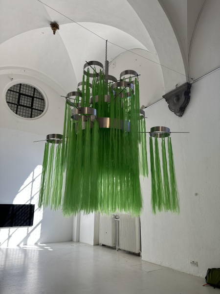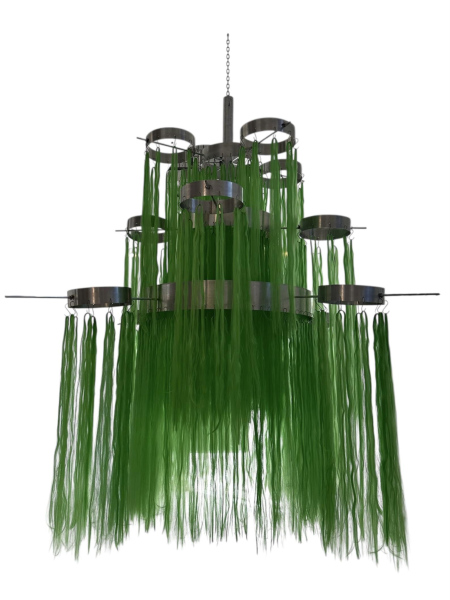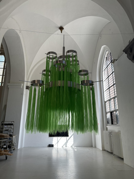Sahar Jamili seeks to reconcile an internal split and assert an insistence on being oneself, an identity composed of fragments. The oversized chandelier draws on a cultural tradition in which large chandeliers are displayed in living rooms as symbols of wealth and status. By amplifying its scale, Jamili both embraces and reclaims this symbol, turning it into a powerful expression of presence, complexity, and belonging. The work becomes a way of reclaiming space in society and reimagining the outsider’s position as something expansive and deeply valuable, rather than marginal.